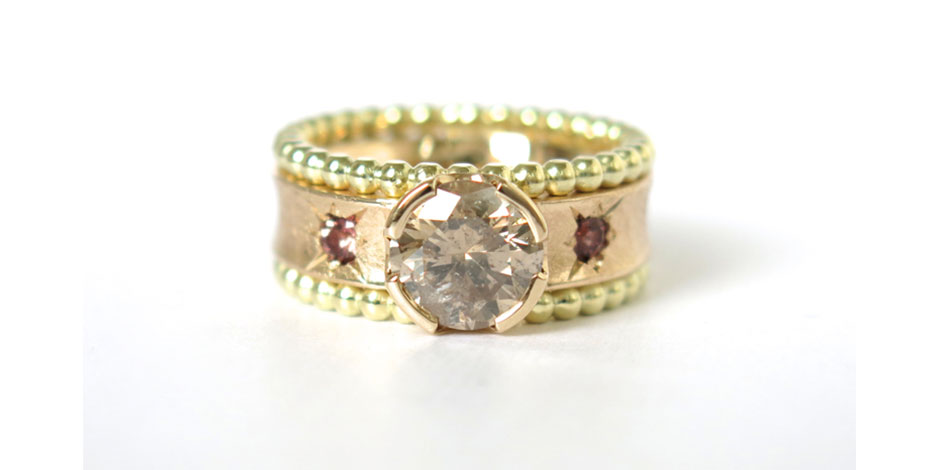 De ‘ 20 jaar en beyond’ ring van Patrick voor Pauline. Rosé- en geelgoud met een Champagne